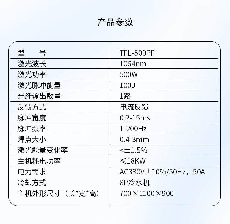 通發(fā)激光TFL-500PF光纖激光焊接機,激光功率大,經過光纖優(yōu)化獲得卓越的光束質量,滿足1.5mm以內料厚,熔深1mm以內的廚衛(wèi),家電,高速不銹鋼激光焊接加工。